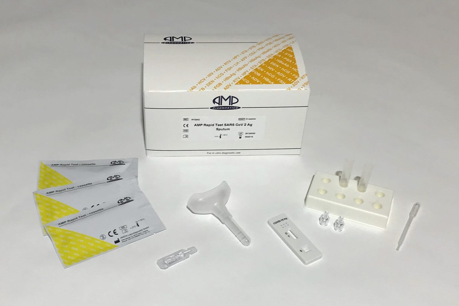 RT3950 – AMP Rapid Test SARS-CoV-2 Ag Sputum 1 Cassette / Casete de prueba, embudo, tubo de muestra y punta del gotero, pipeta, tampón, bolsa (1 de cada uno)